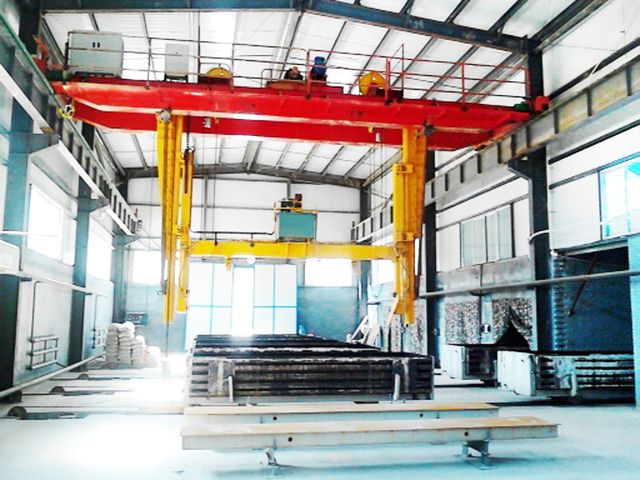 絕緣加料起重機是在絕緣橋式起重機的基礎上通過增設加料小車,完成下列工藝操作:·為電解槽加氟化鋁·吊運電解槽上部機構和槽殼·出鋁并計量·吊運陽極母線提升框架·電解車間的其它零星吊運作業主要用于電解車間內高溫熔鹽、大電流、強磁場、多粉塵和氟化氫氣氛的環境。絕緣加料起重機由橋架、大車運行機構、工具小車、出鋁小車、加料小車、電氣控制系統、空壓機及氣路控制系統、液壓站及油路控制系統幾部分組成。橋架采用三梁三小車結構,主梁上鋪有供小車行駛用的軌道,偏軌布置,起重小車和出鋁小車同軌道運行,加料小車在另側軌道運行。大車運行機構采用8輪2驅動,配軸裝式三合一減速器,設有水平導向輪、工具小車用于吊運一般物品,起升機構類似于吊鉤橋式起重機,運行機構采用軸裝式三合一驅動。出鋁小車是出鋁及吊運重物的專用機構。結構形式同工具小車一樣。為保證吊鉤無擺動,設有剛性導向架。并用電子稱對鋁水稱重,可大屏幕顯示單臺槽吸鋁量和累加量及總重。運行機構采用軸裝式三合一驅動。吊鉤絕緣防磁。加料小車由運行機構、車架、料倉、下料管卷揚裝置、料倉上下限料位計、料位電子測量裝置及下料閥等部件組成。運行機構采用軸裝式三合一驅動。司機室和電氣室均配有工業冷暖空調。